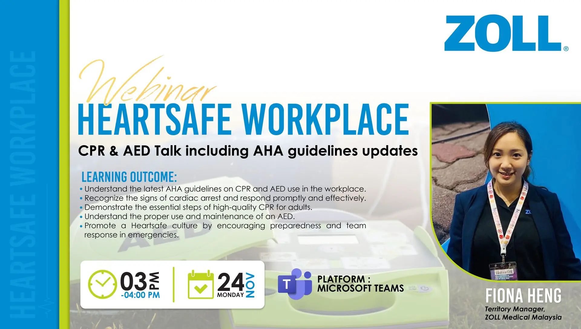 Led by Fiona Heng, Territory Manager at ZOLL Medical Malaysia, this webinar will guide participants through essential CPR and AED practices, ensuring your organization is ready to take immediate and effective action when it matters most.